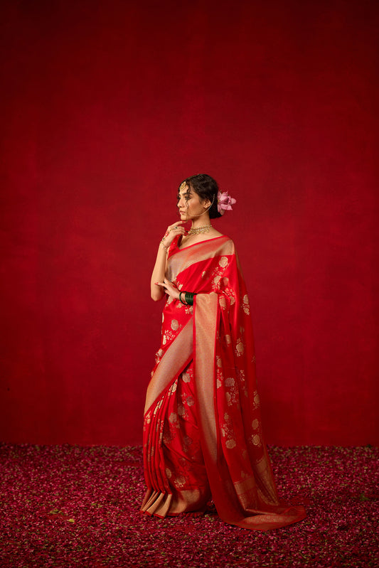 Red Viscose Saree with Heavy Zari Floral Work