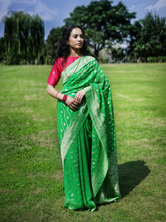AMRITA - LIME GREEN VISCOSE SAREE WITH DIAGONAL WAVE PATTERN AND BUTTA