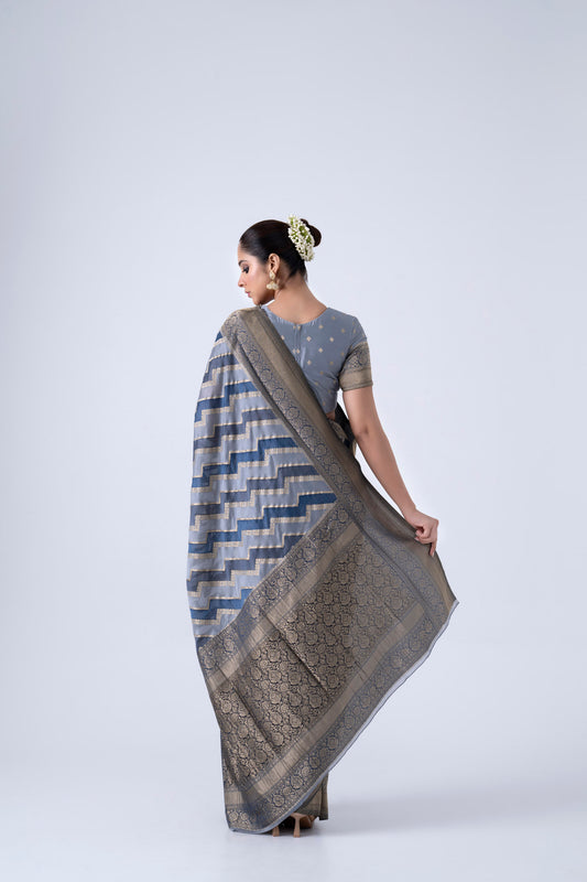 Blue And Grey Zigzag Pattern Viscose Saree