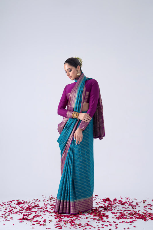 Teal Blue Viscose Saree With Checked