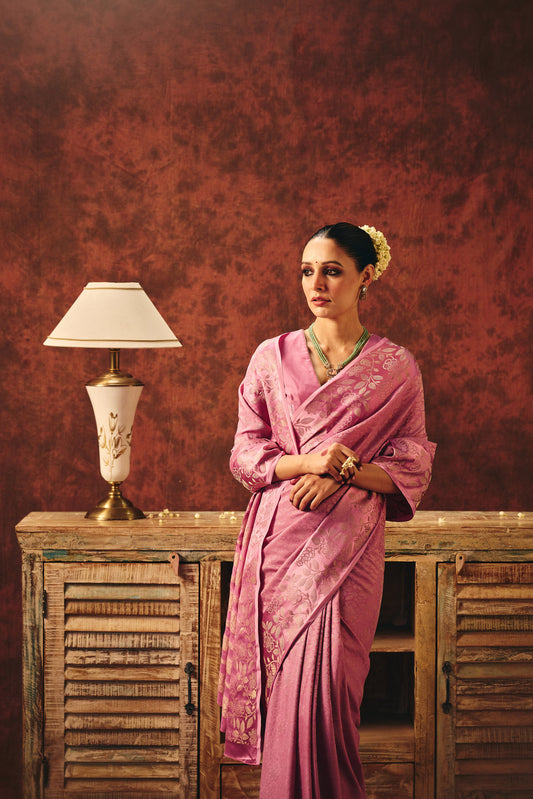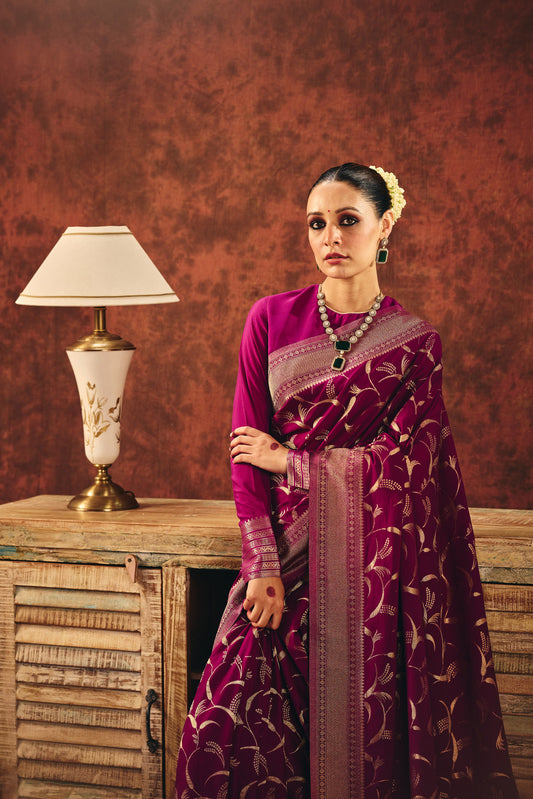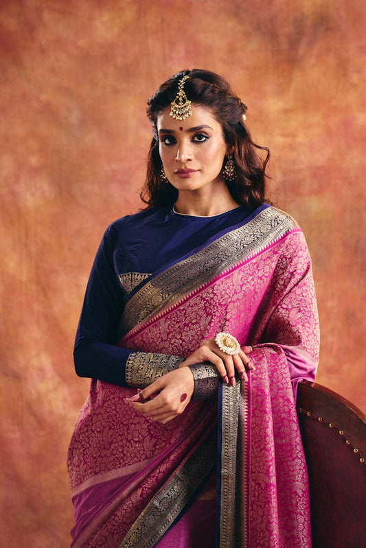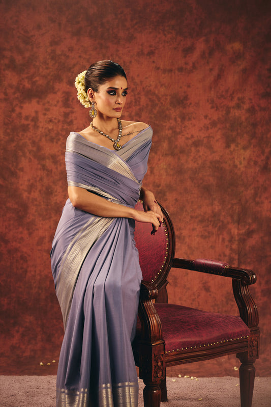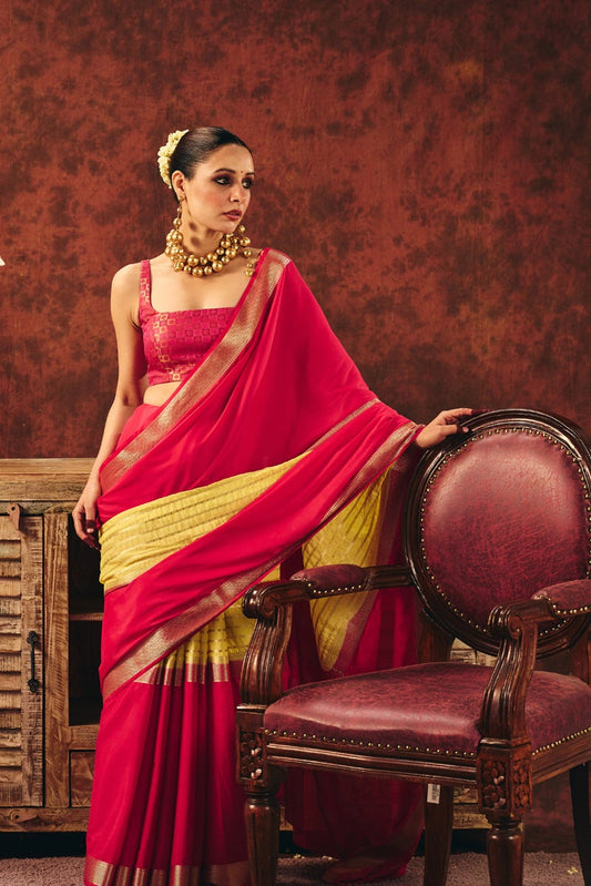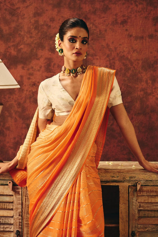 Two-Tone Crepe Jacquard Saree with Striped Weave & Gold Border