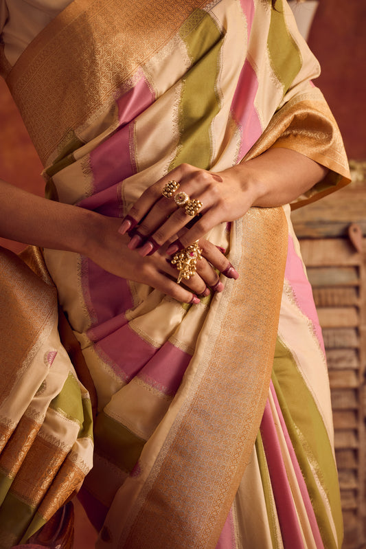 Pastel Viscose Saree with Gold Zari Border & Striped Design