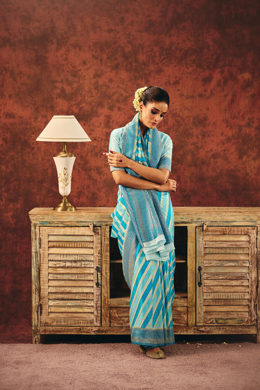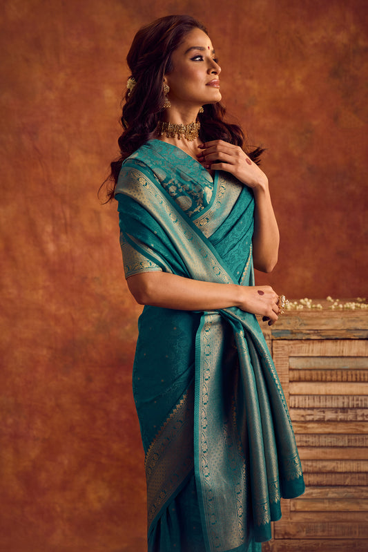 Teal Blue Viscose Jacquard Saree with Gold Border