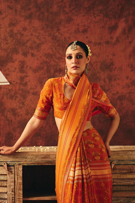 Printed Satin Jacquard Saree with Gold Zari Detailing