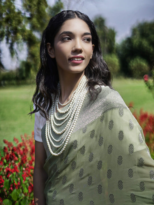 PALLAVI - OLIVE GREEN VISCOSE SAREE WITH FLOWER PRINT