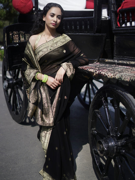 ZAARA - BLACK AND GOLD VISCOSE SAREE WITH MINIMAL BUTTI