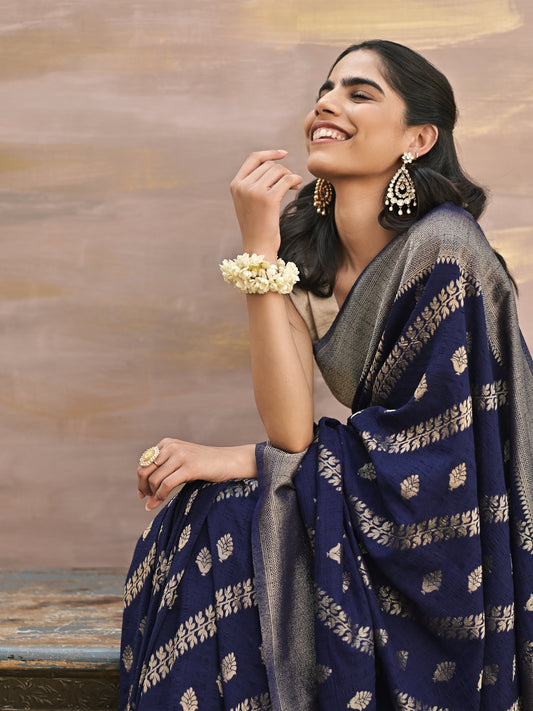 ZAARA - NAVY BLUE VISCOSE SAREE WITH DIAGONAL STRIPS PATTERN AND BUTTI