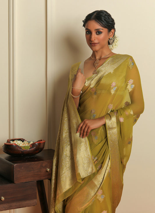 GULZAR - OLIVE GREEN CHIFFON SAREE