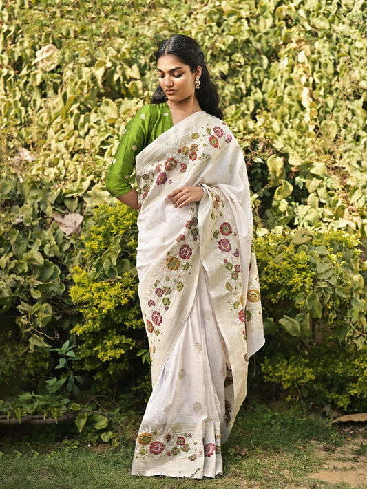 ELINA - OFF WHITE VISCOSE SAREE OVERALL BUTTI WITH COLOURFUL FLORAL BORDER