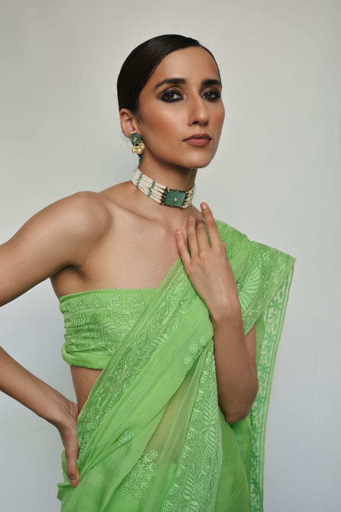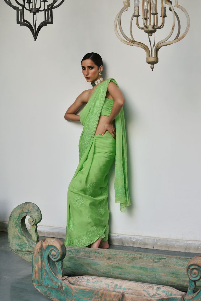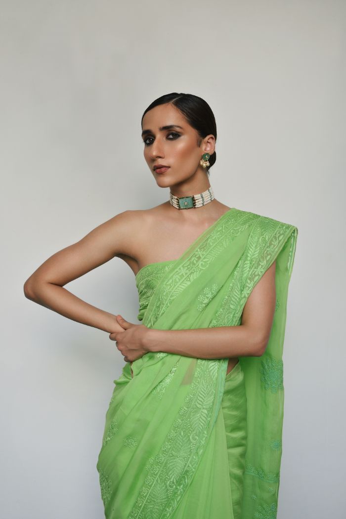 Organza embroidered saree with floral big buti all over saree with leaf veil patterned floral border.