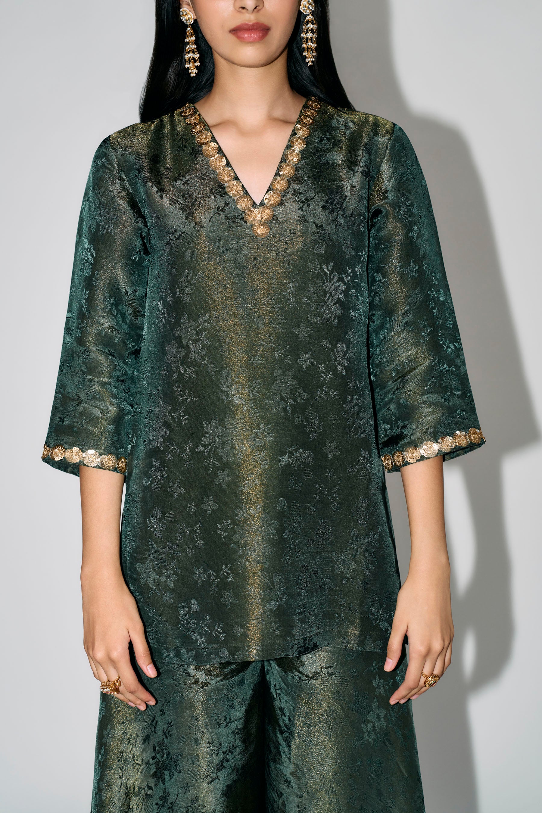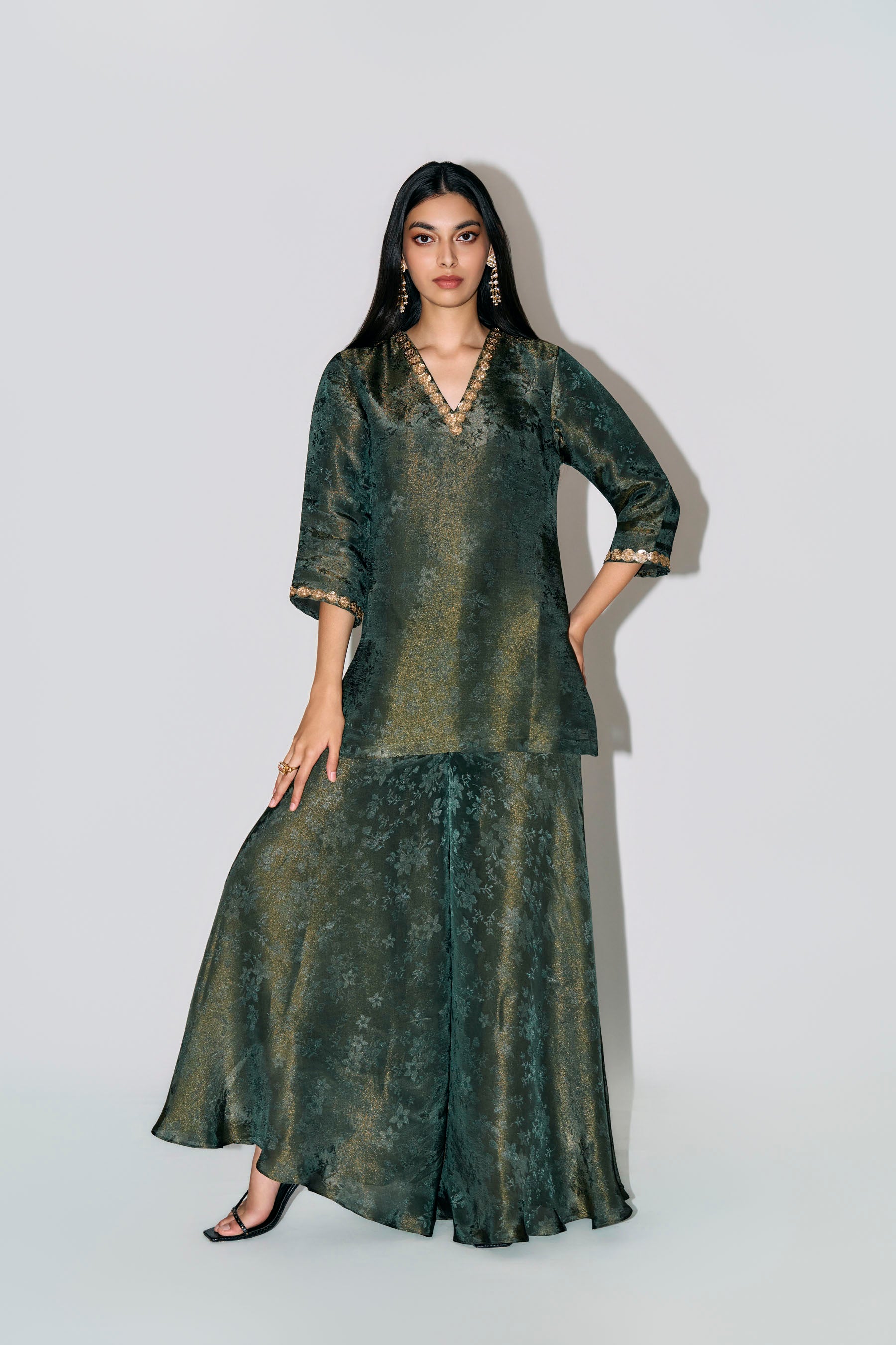 A luxe emerald tissue kurta and flared palazzo set, highlighted with gold lace detailing and a fluid festive drape—perfect for effortless occasion dressing.