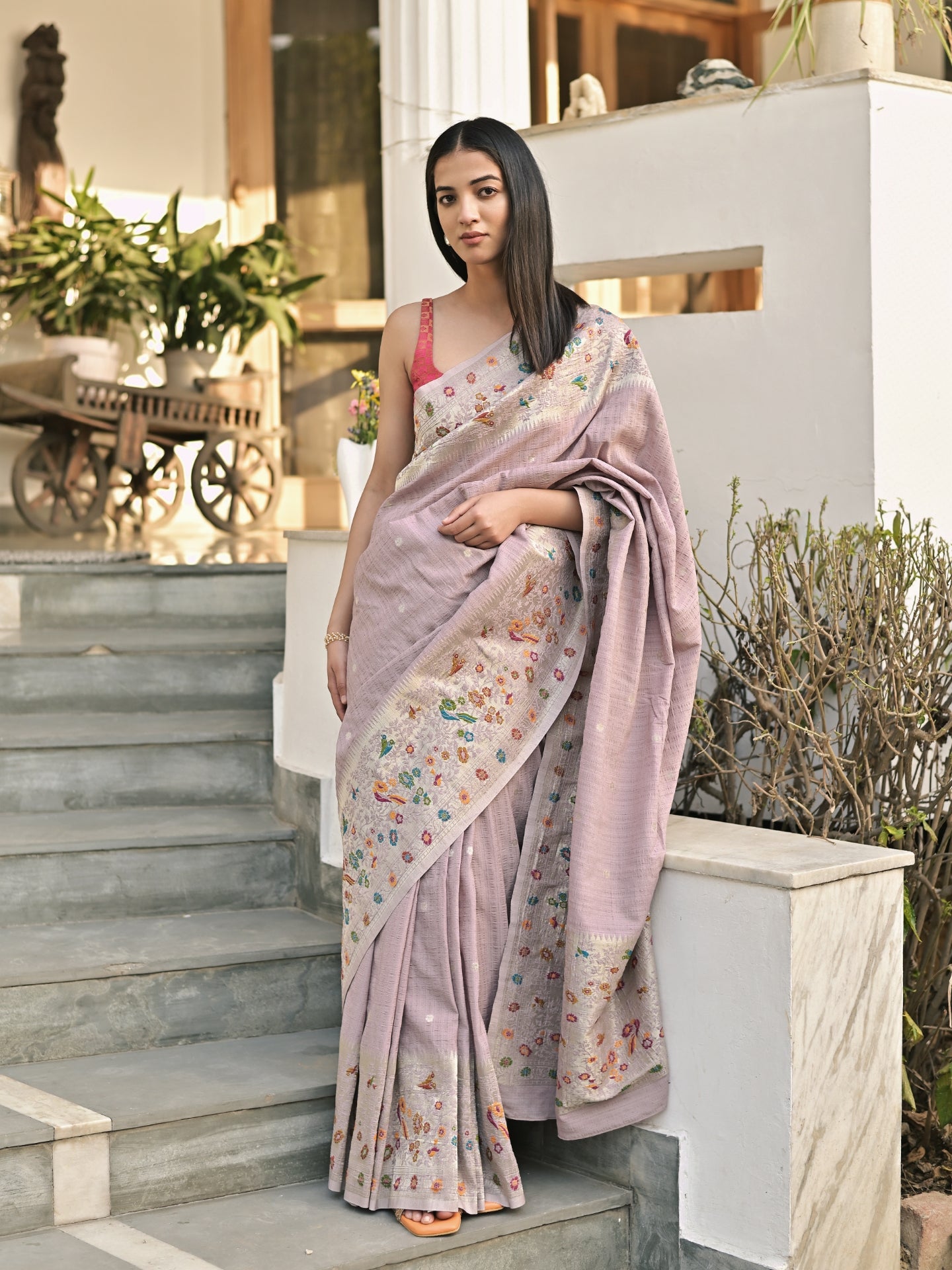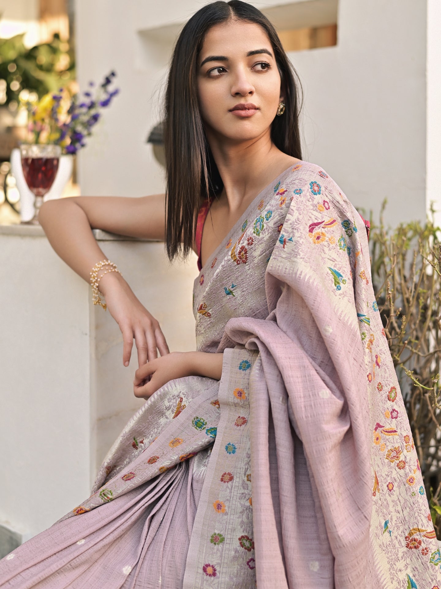 Experience the refinement of this Dusty Pink Viscose Saree, featuring a vibrant floral border bursting with color. Crafted with our signature silver zari, produced in-house, this saree exudes timeless grace and understated luxury. Flaunt your individuality with every graceful drape, making a statement that speaks volumes without uttering a word.