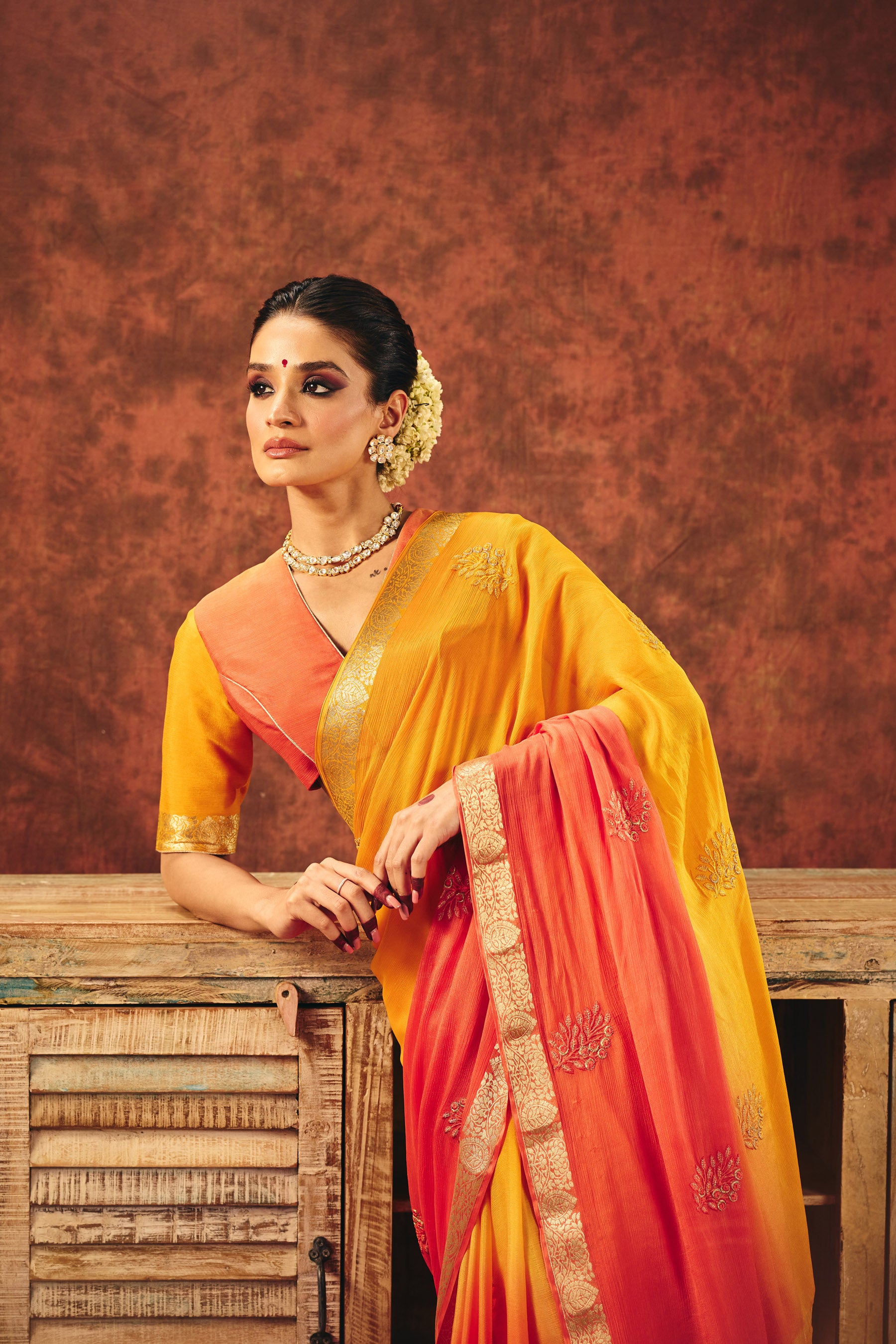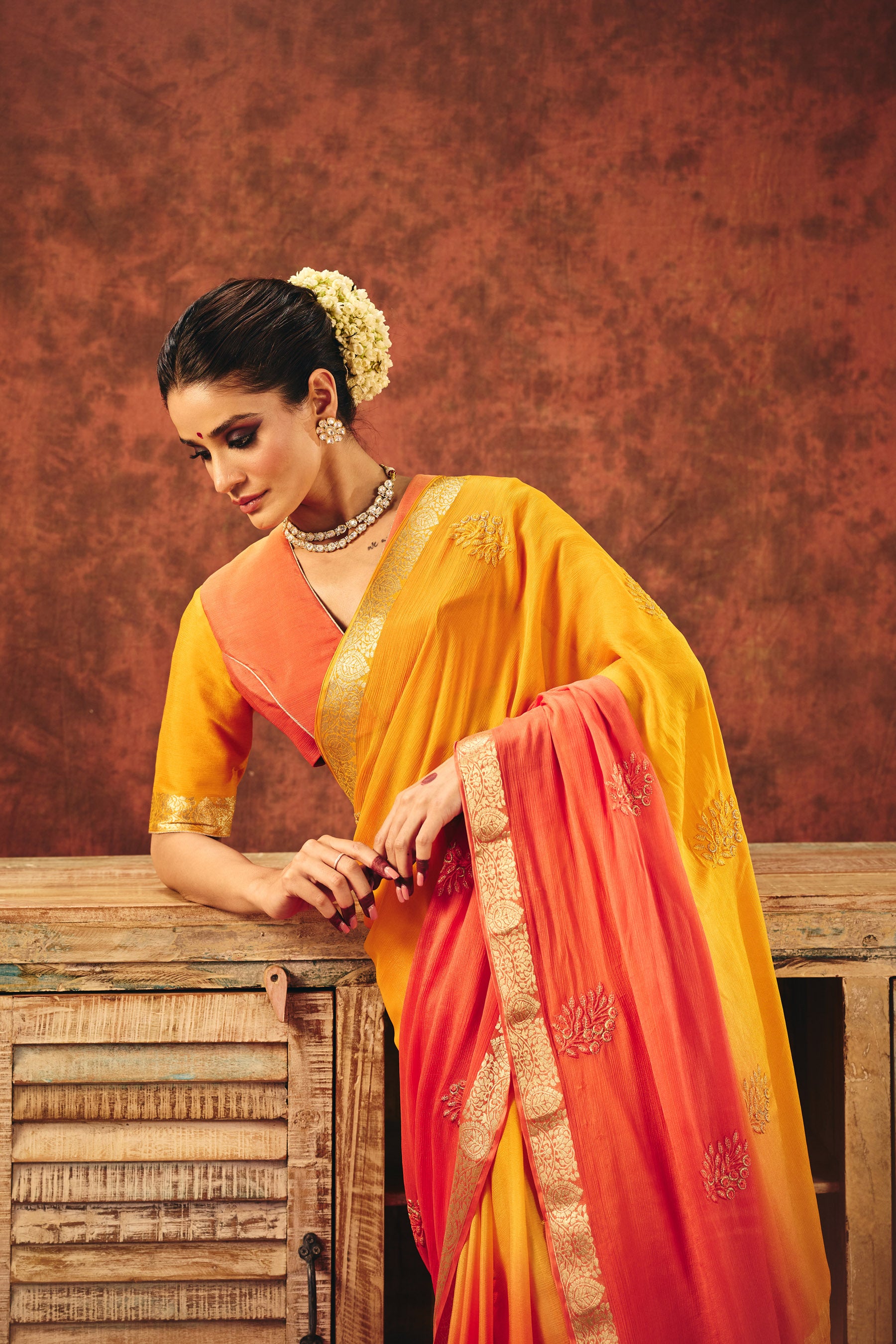 Drape yourself in elegance with the Ember Glow Embroidered Chiffon Saree, a perfect blend of grace and sophistication. The lightweight chiffon fabric flows beautifully, ensuring effortless movement and a flattering drape. Delicate embroidered motifs adorn the saree, adding a touch of intricate craftsmanship, while the golden border enhances its regal appeal. Ideal for festive occasions, weddings, and celebrations, this saree comes with an unstitched blouse piece, allowing for a customized fit.