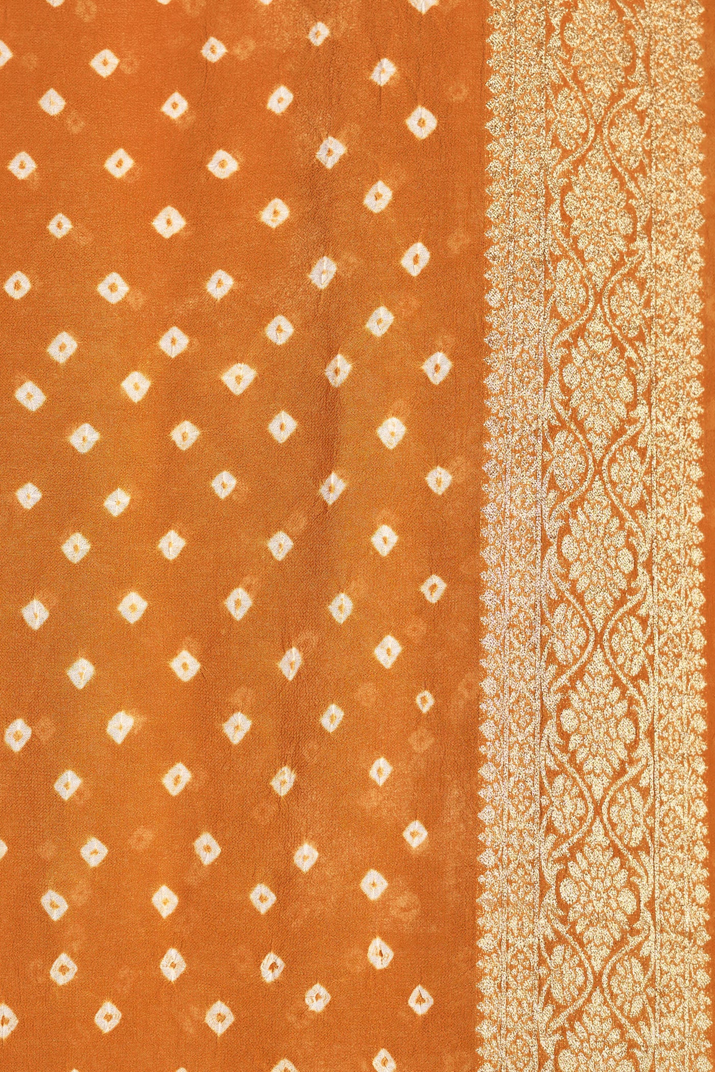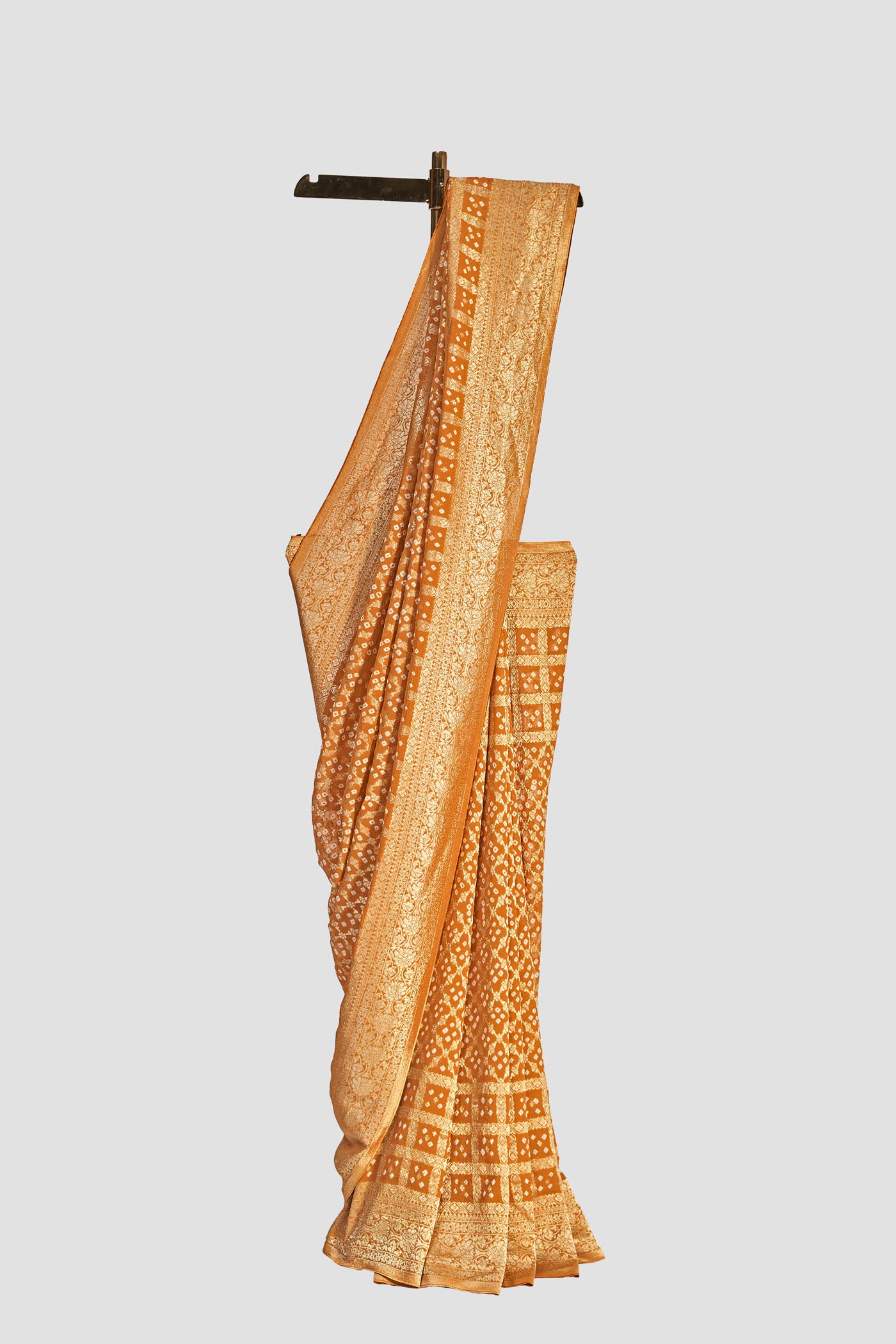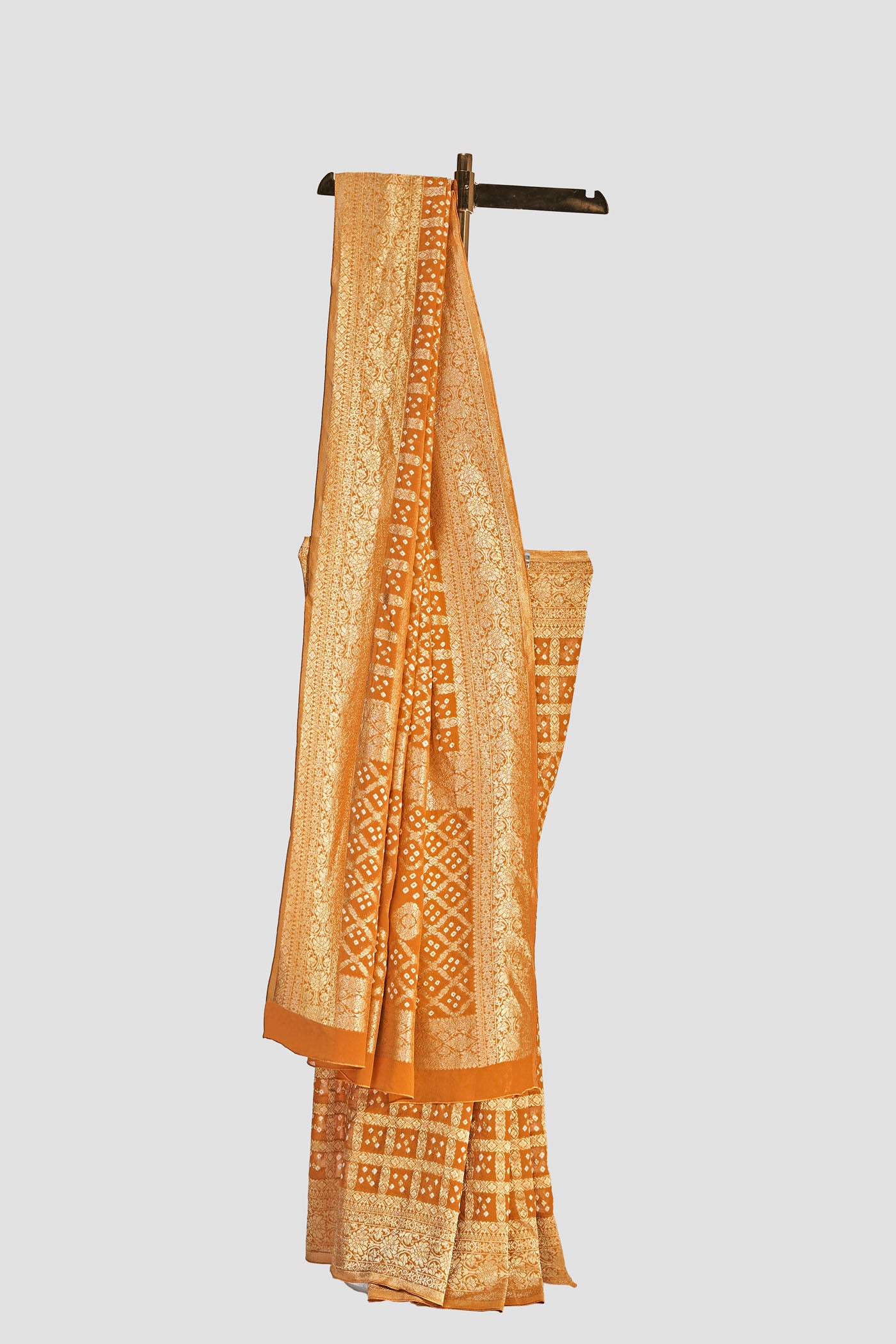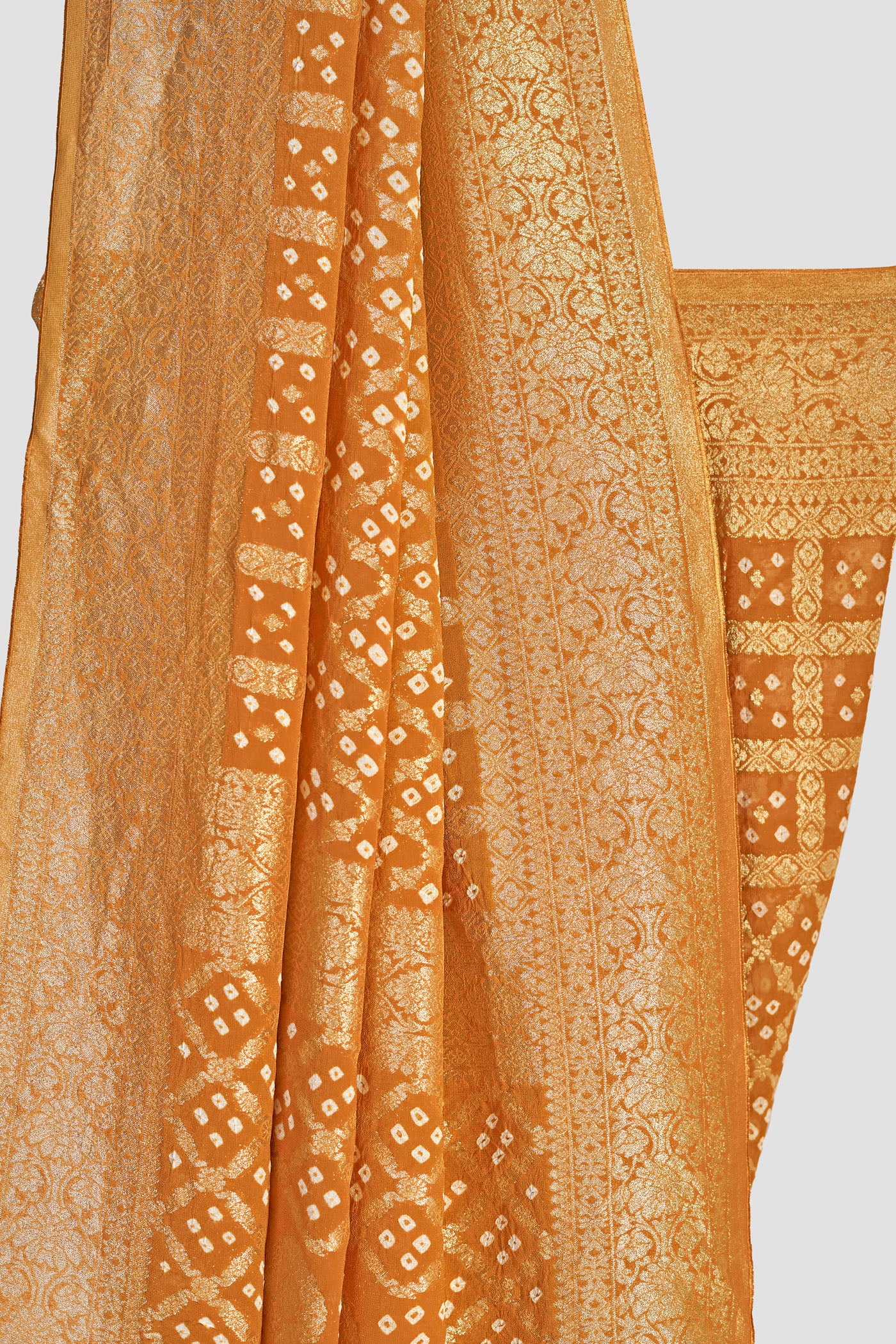 The Bandhani Georgette Saree is made by pinching very small portions of cloth and tying them into many tiny bindings that form a figurative design to form an intricate pattern of dots by plucking the cloth with the fingernails.