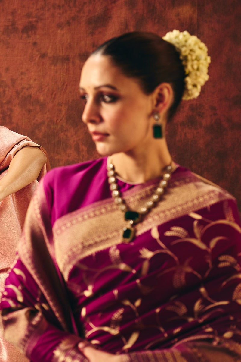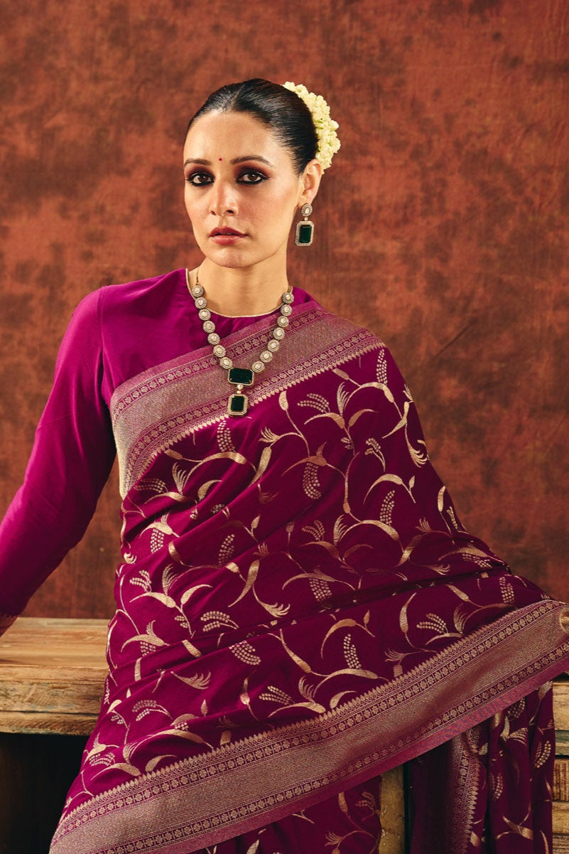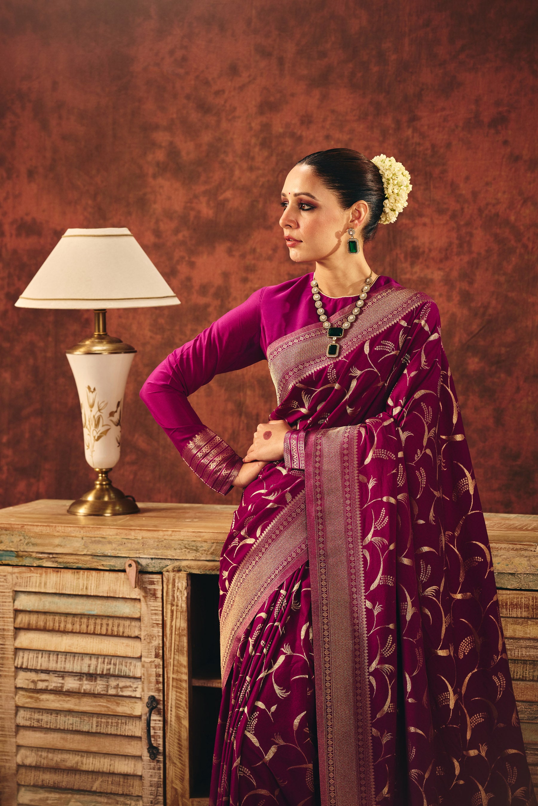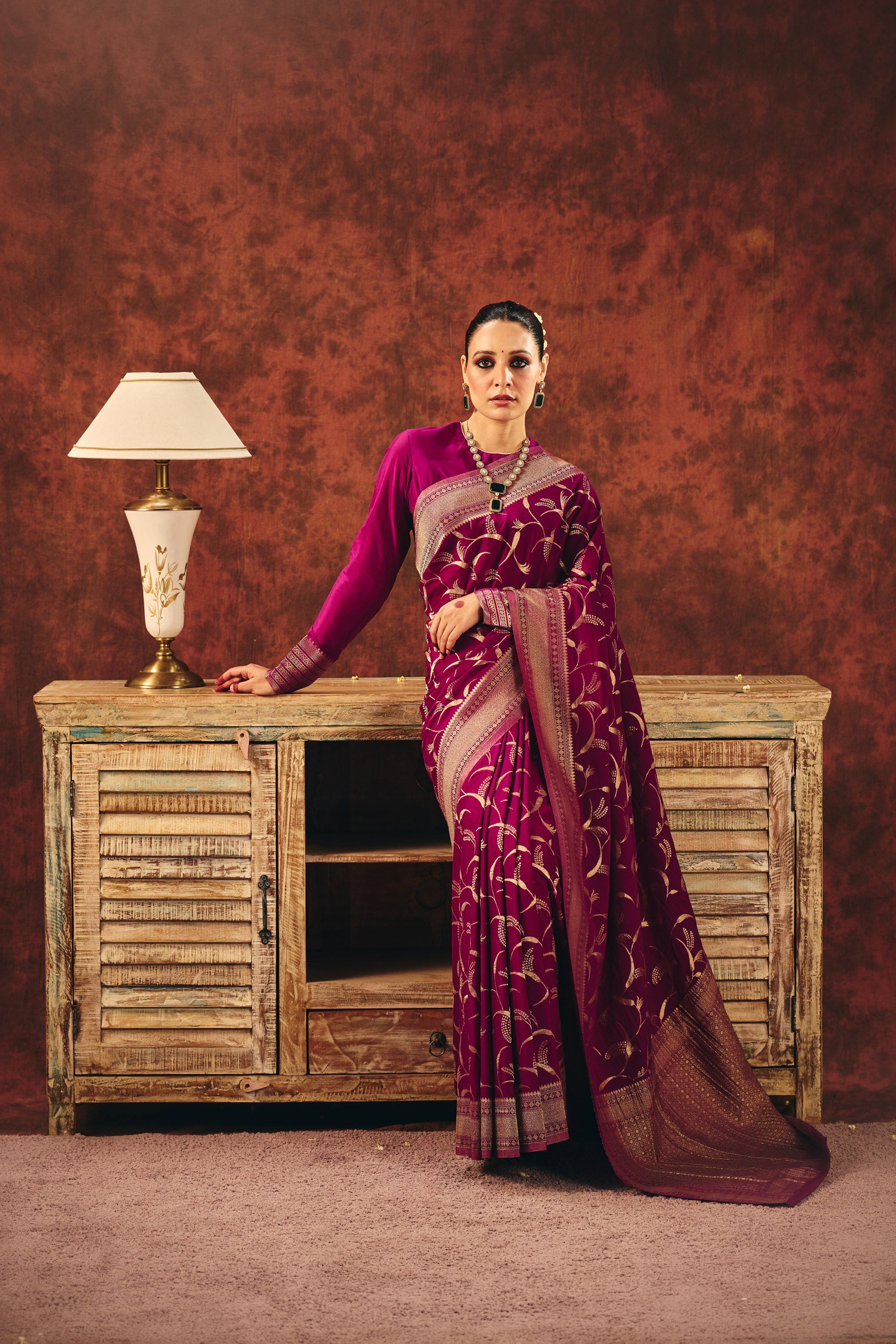 Introducing the Imperial Wine Jacquard Saree, a masterpiece of luxury and elegance. Woven with intricate jacquard artistry, this saree features a deep, opulent wine hue adorned with delicate gold motifs. The shimmering zari accents and exquisitely detailed border lend a regal touch, making it the perfect choice for soirées, weddings, and grand celebrations.