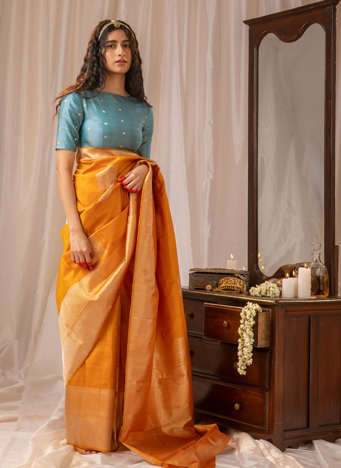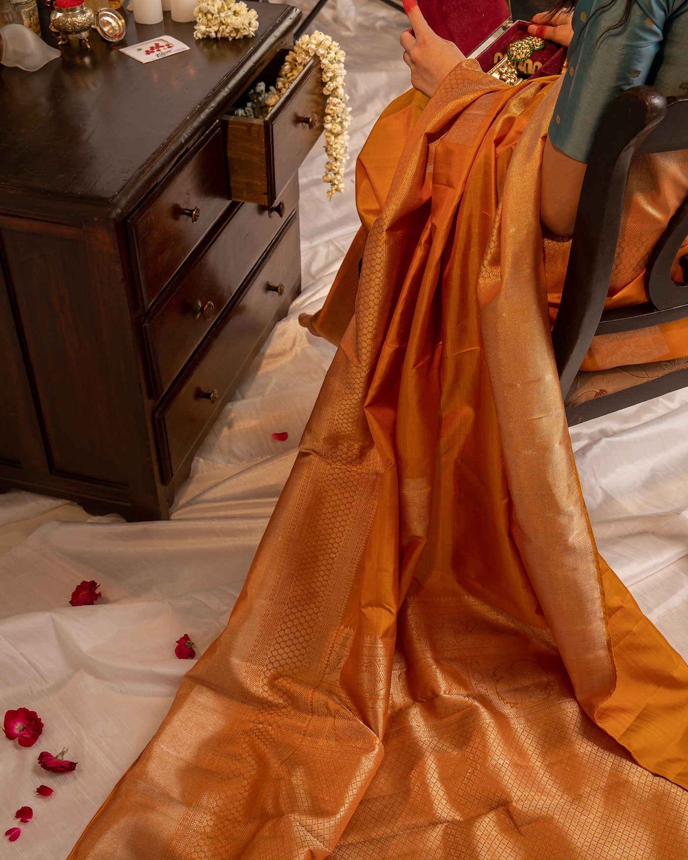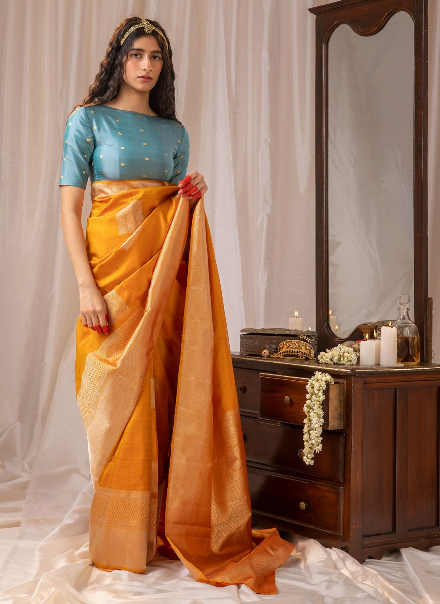 - Also, expect differences in the colour and weave of the saree as each saree is uniquely handwoven.