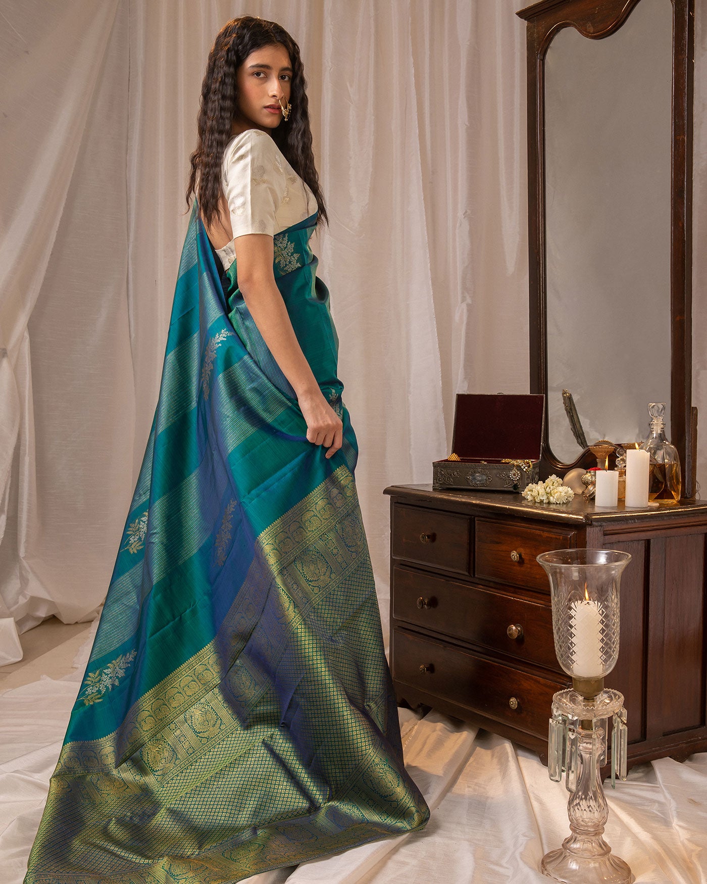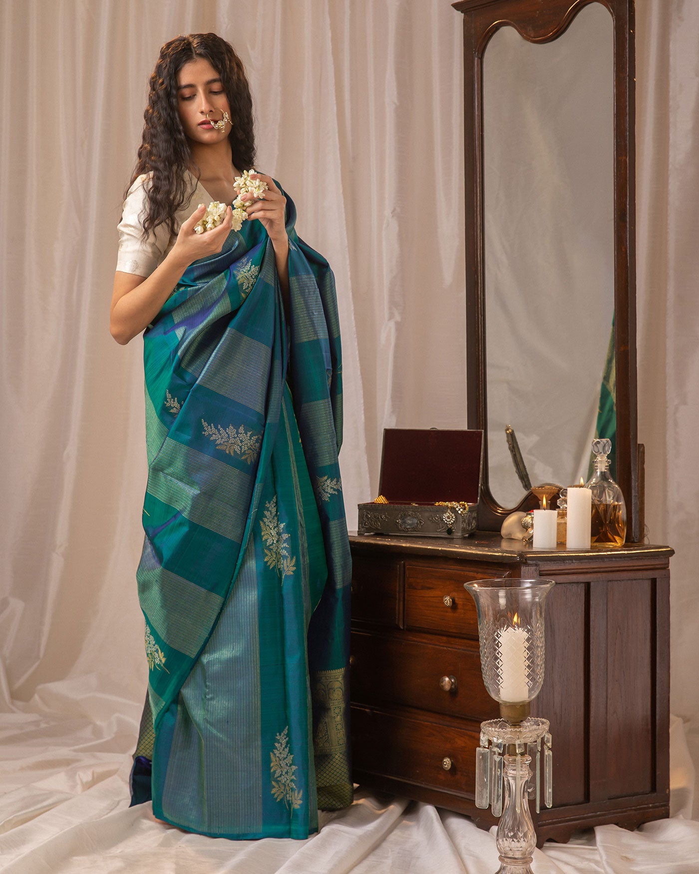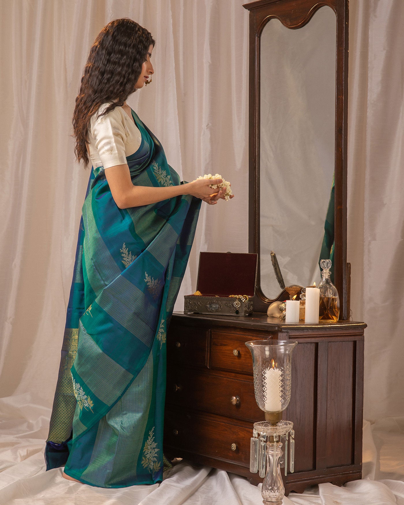 - Also, expect differences in the colour and weave of the saree as each saree is uniquely handwoven.
