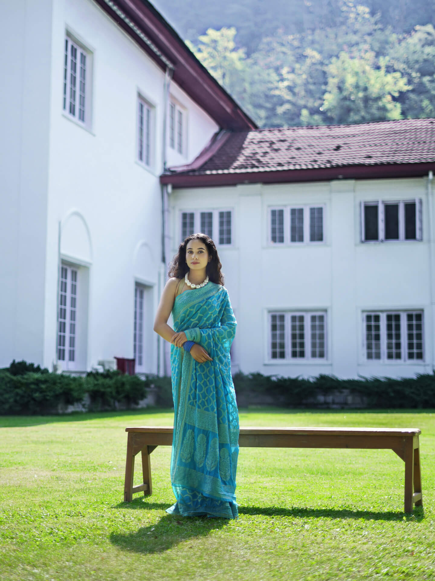 Immerse yourself in cinematic elegance with the Blue Zari Saree from SILSILA With all over jaal in gold and silver zari from our in-house studio dance across the saree, weaving a tale of grace and sophistication inspired by Yash Chopra's timeless heroines.