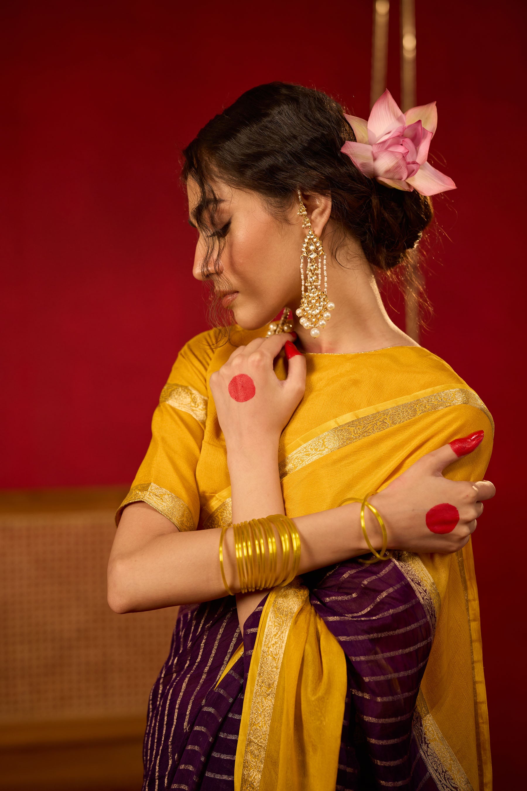Mustard Yellow & Plum Viscose Saree with Gold Zari Stripes and Traditional Border