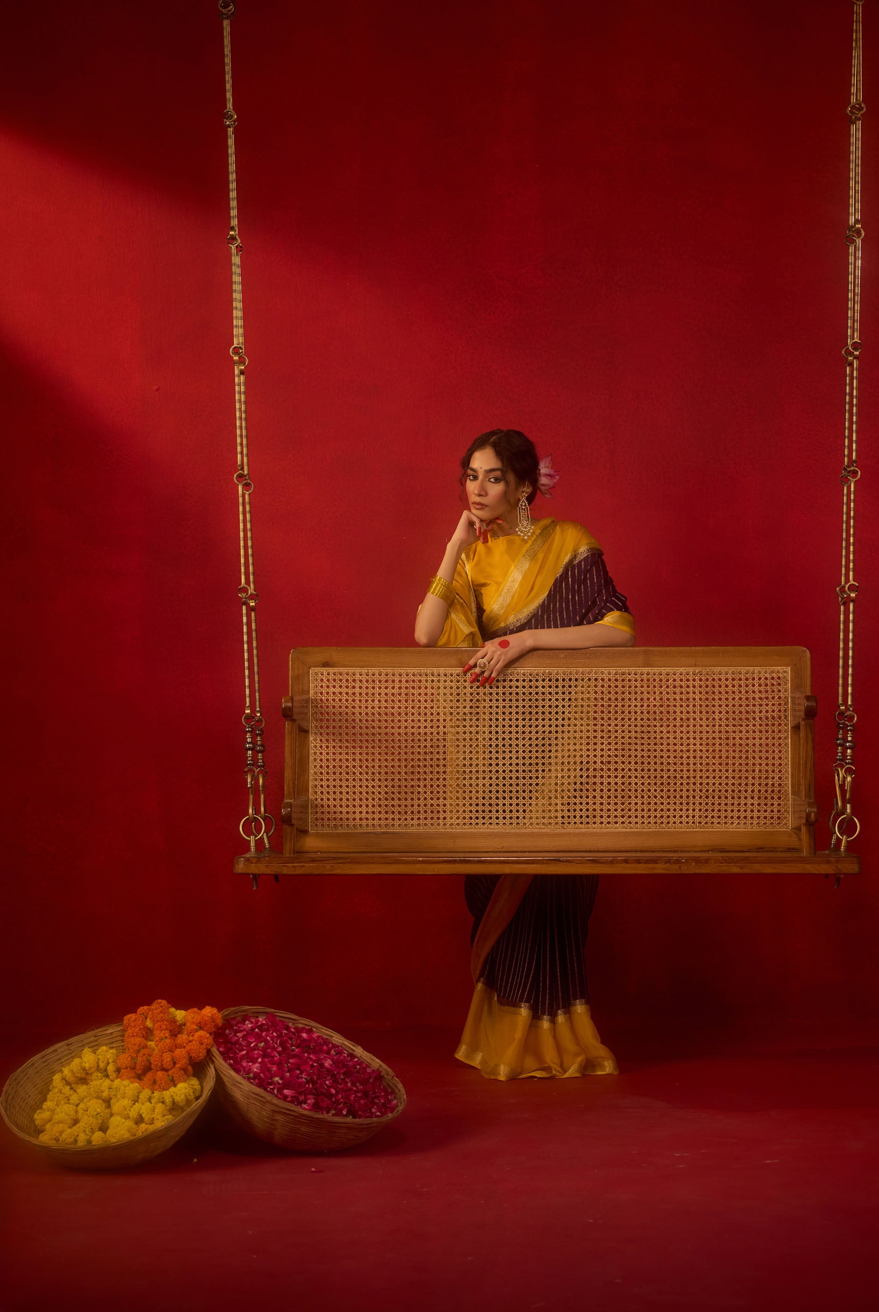 Color – Mustard yellow pallu and border contrasted with a deep plum striped body