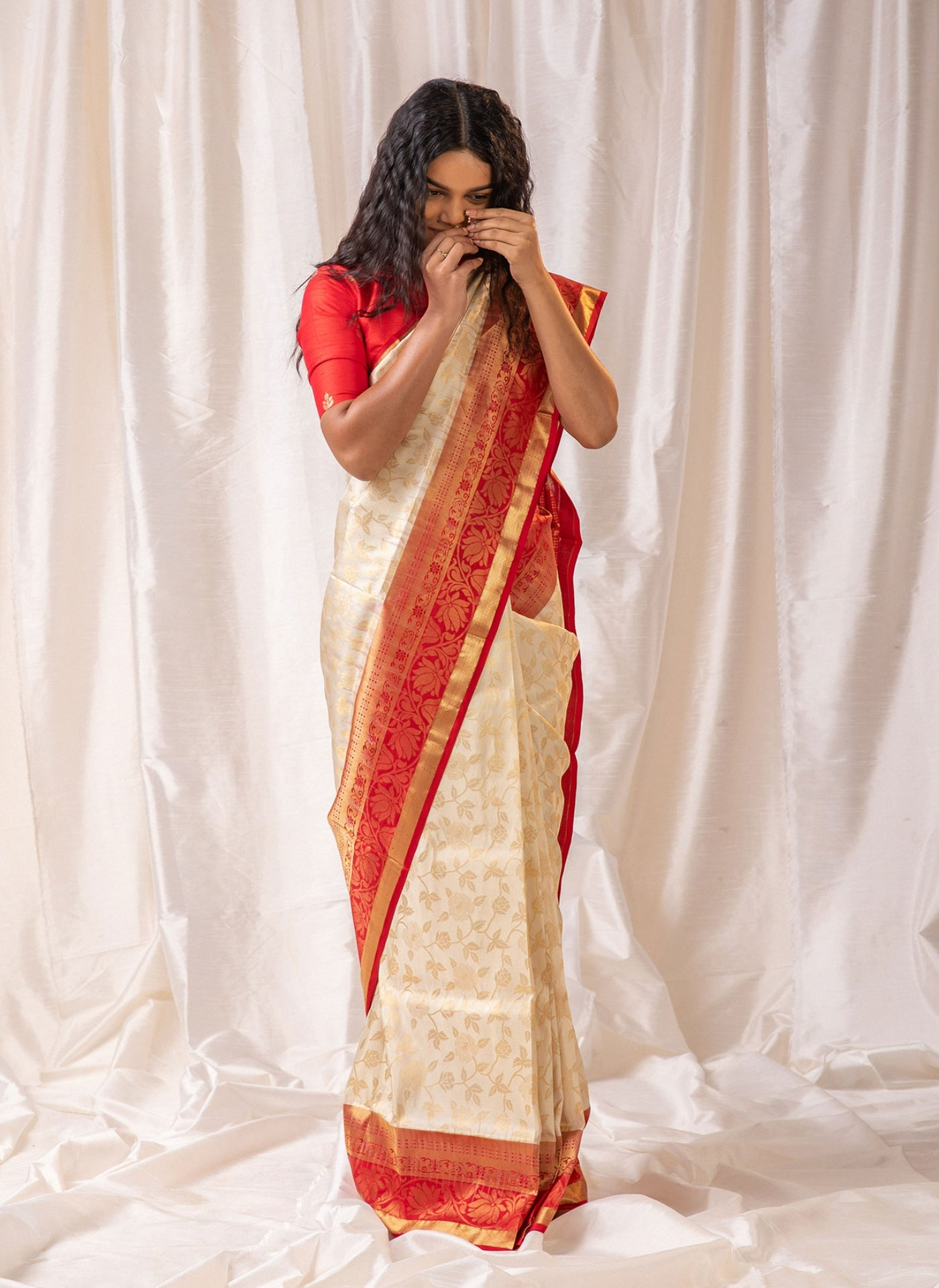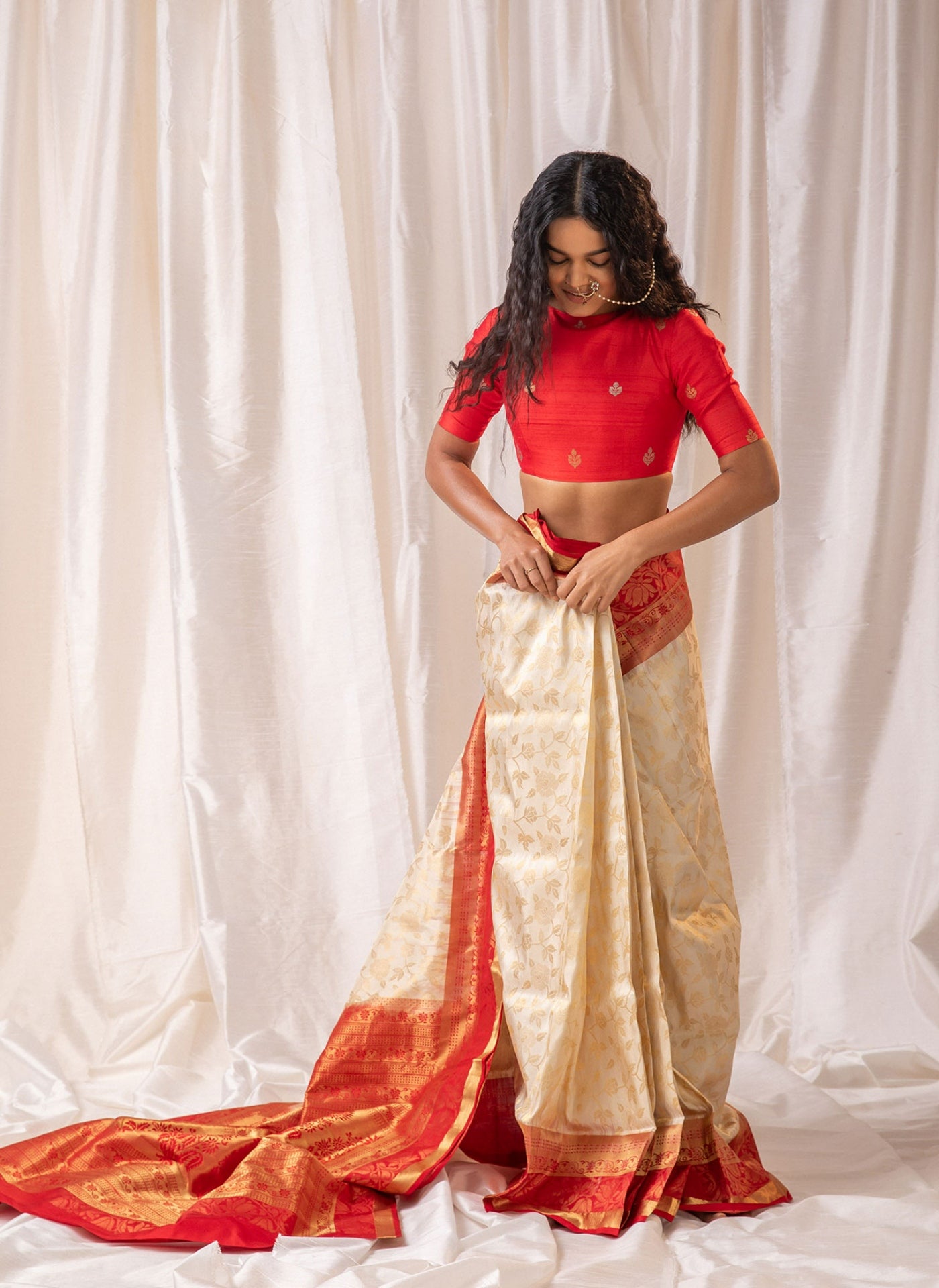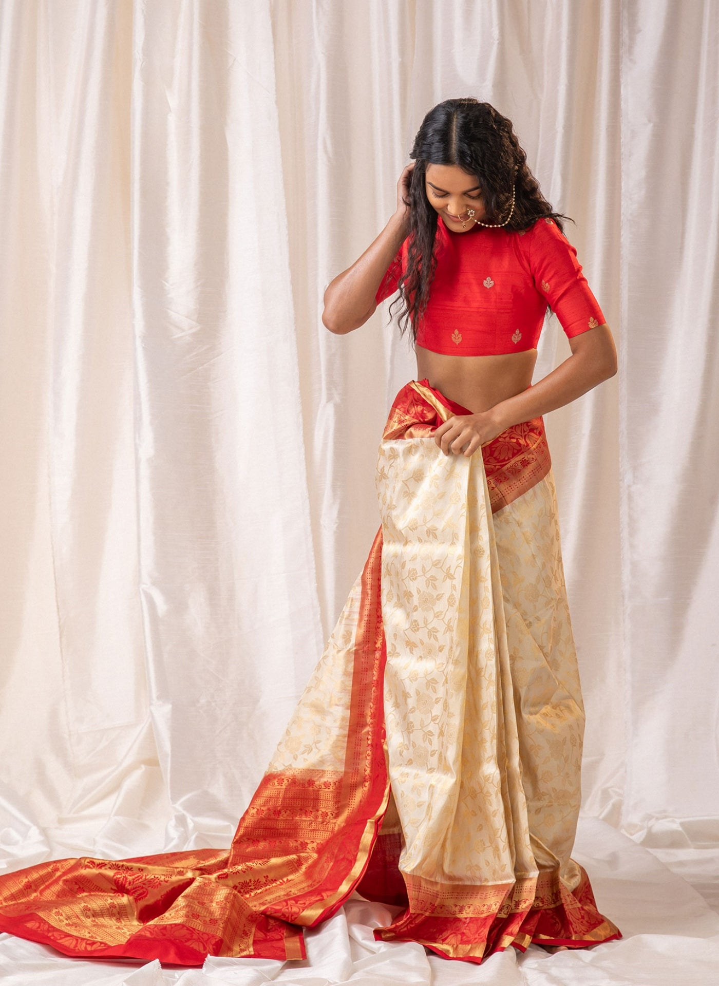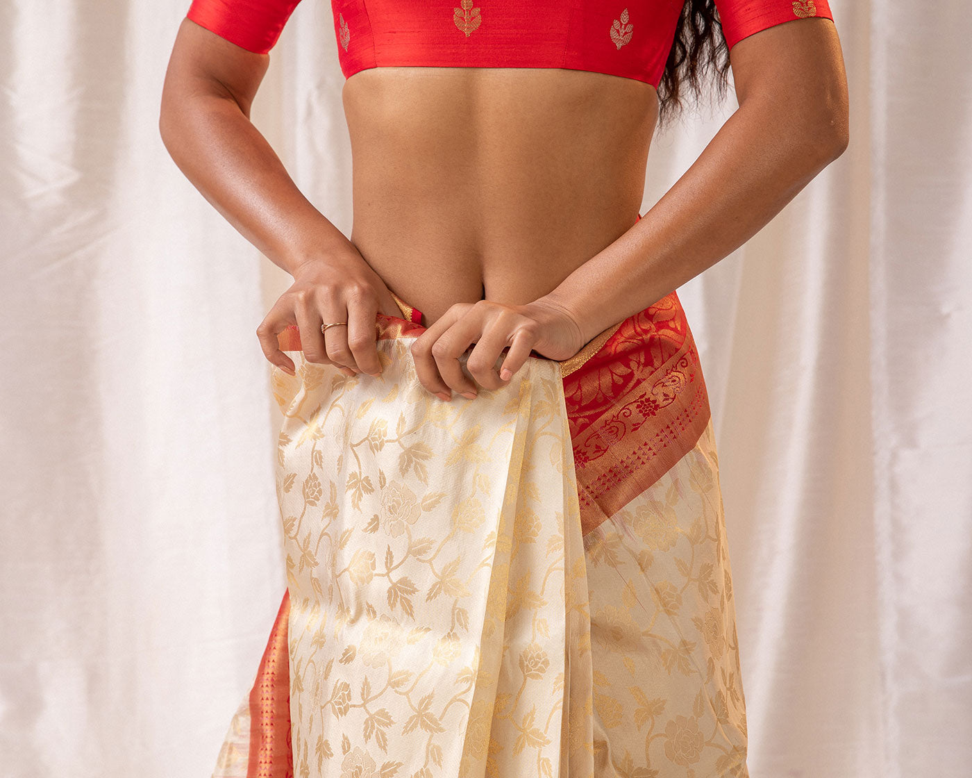 - Also, expect differences in the colour and weave of the saree as each saree is uniquely handwoven.