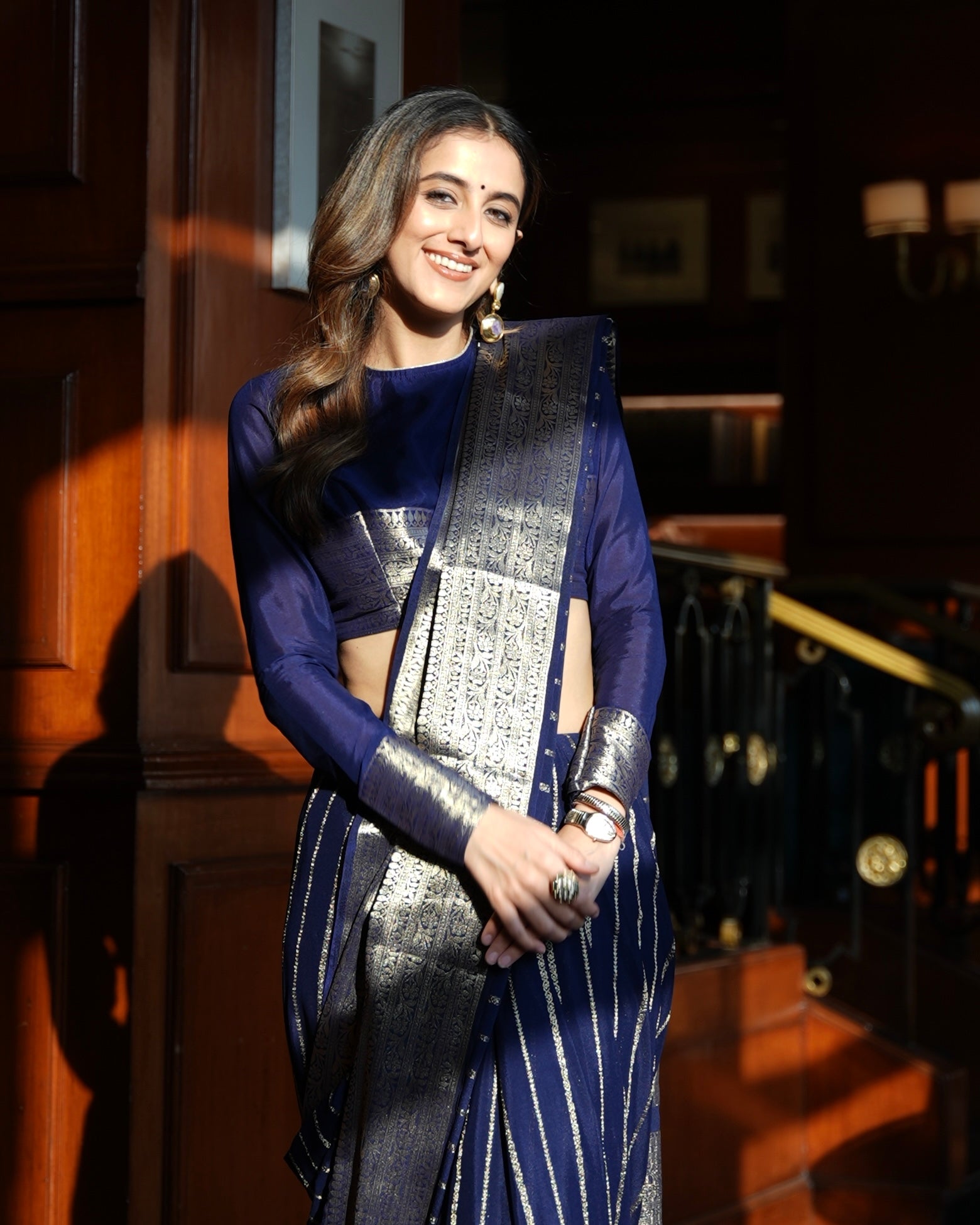 Navy blue crepe saree with stripes