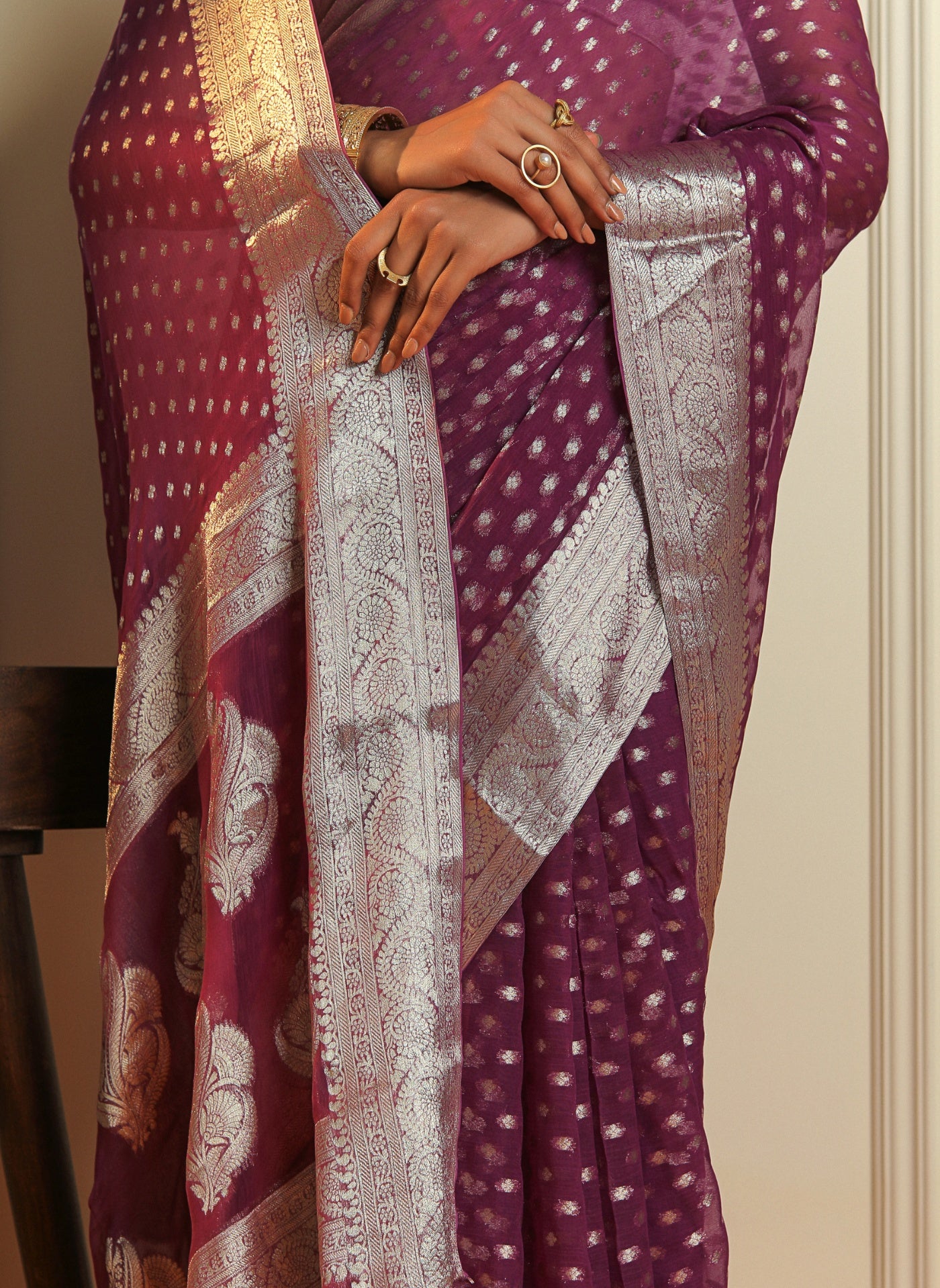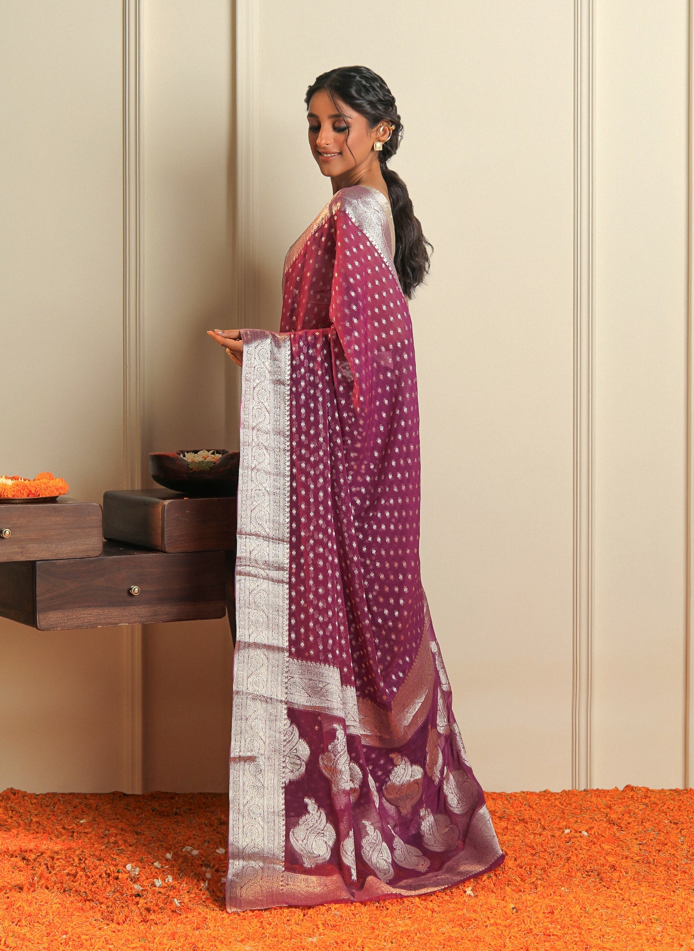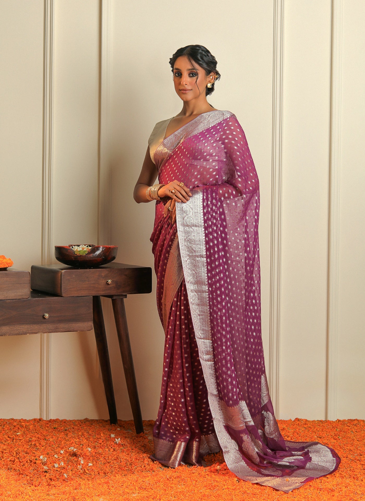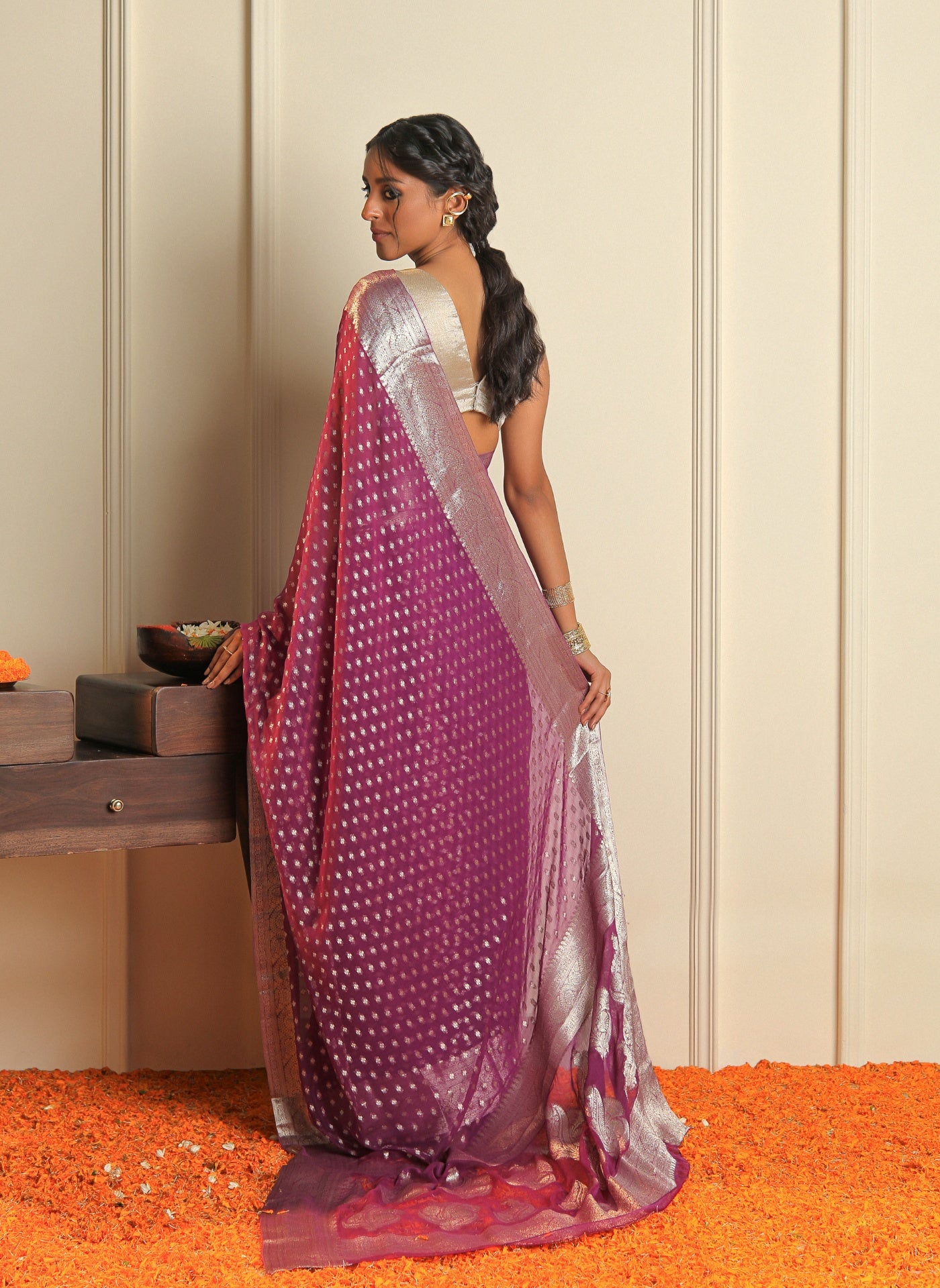 Viscose Chiffon with a small floral butti motif all over the saree and floral border