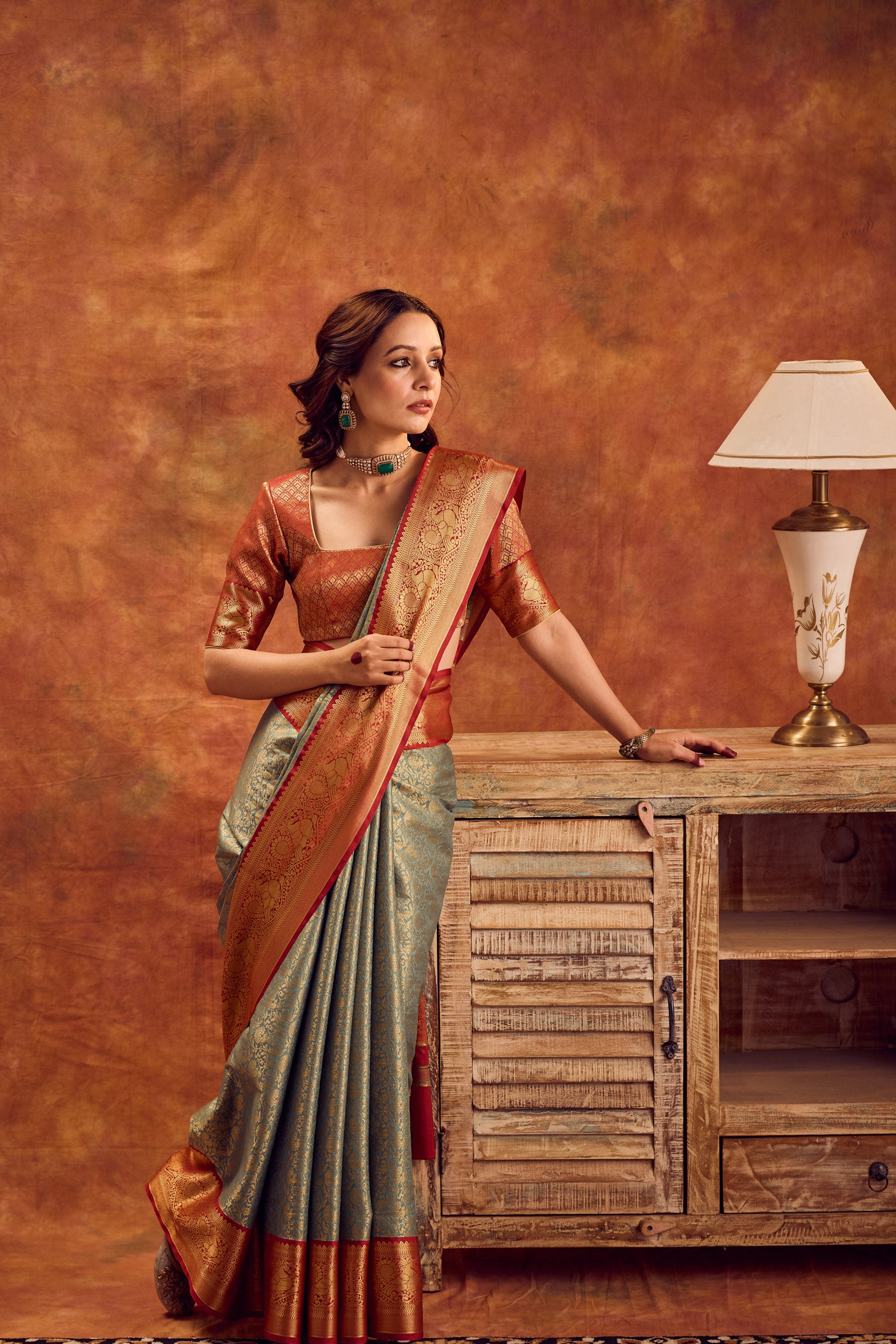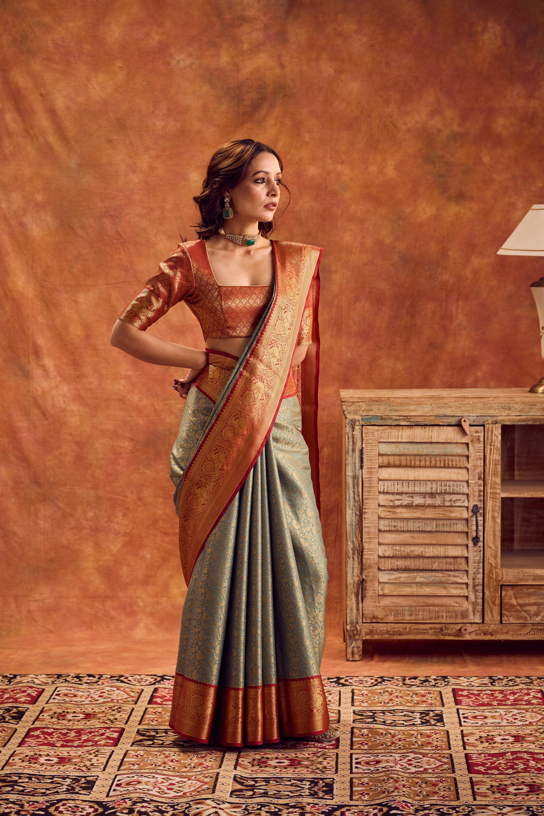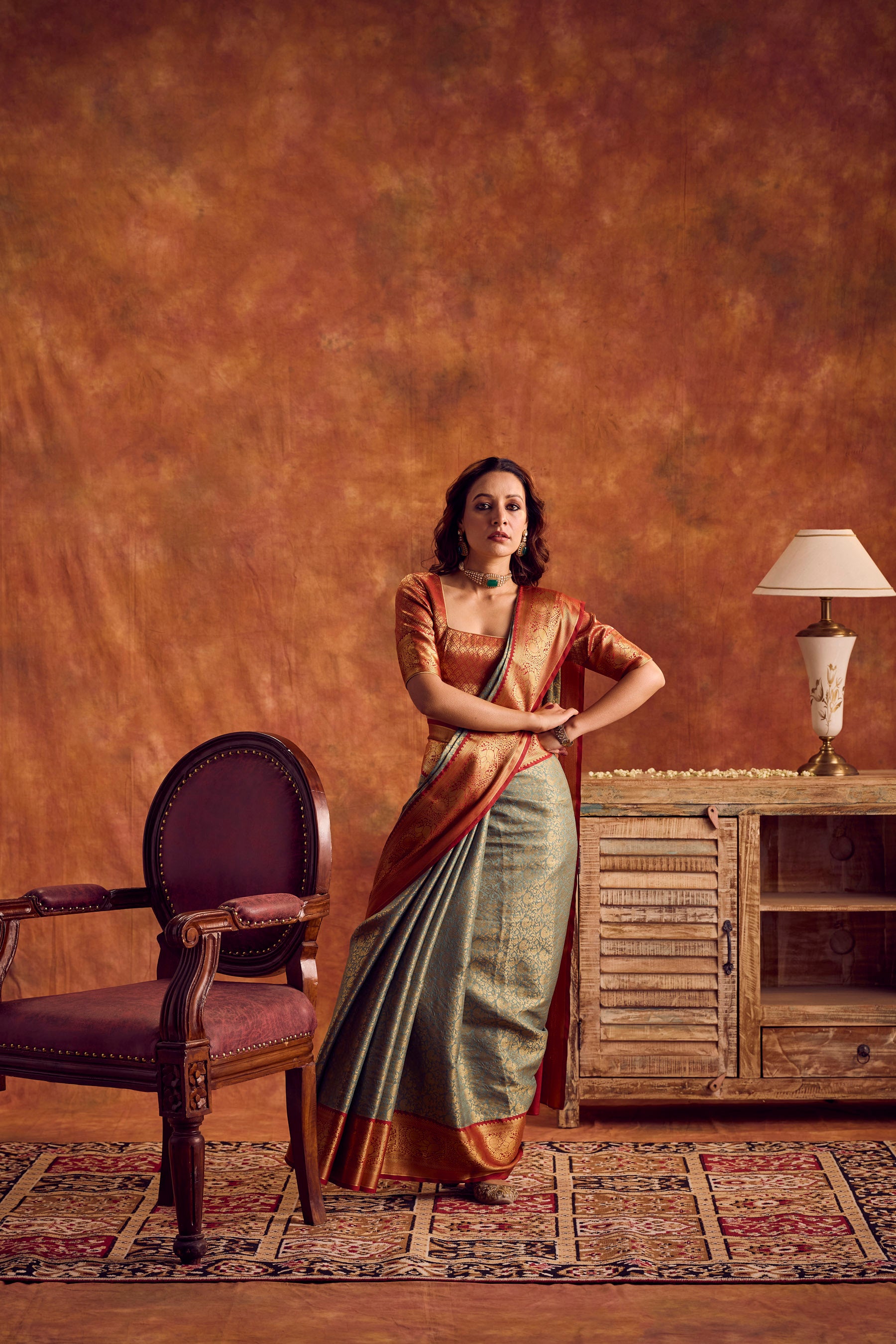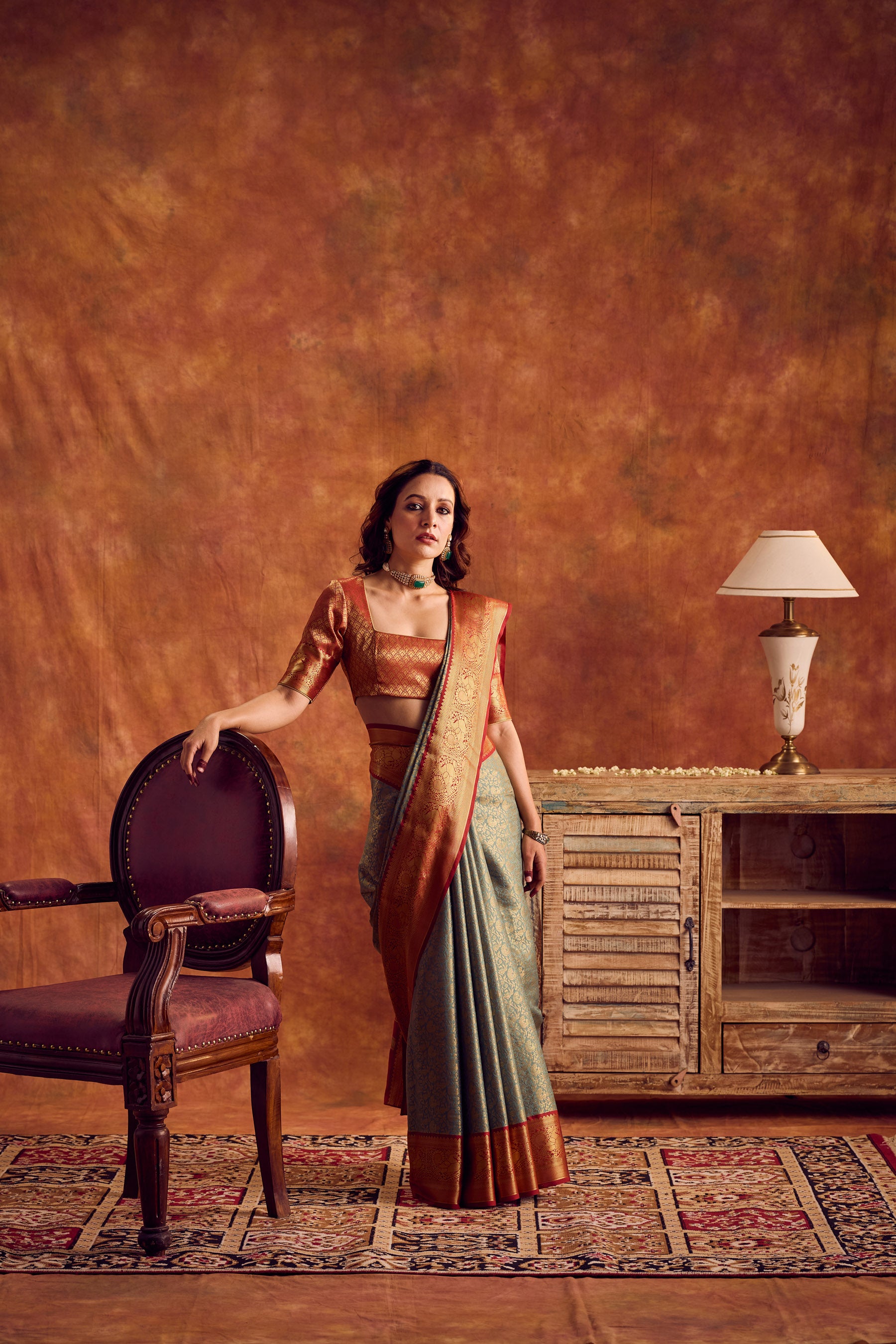 Step into timeless elegance with our sage green Banarasi silk blend saree, adorned with an opulent rust-hued brocade border intricately woven with gold zari. The saree’s body features delicate floral motifs in shimmering gold, adding a regal touch to this exquisite drape. The contrast border and rich pallu exude heritage charm, making it the perfect choice for festive celebrations, weddings, and grand occasions.