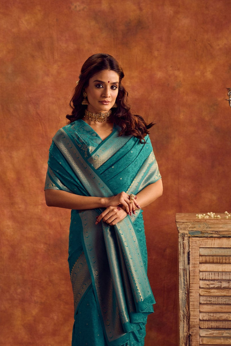 Drape yourself in elegance with our teal blue viscose saree, adorned with intricate jacquard weaving . The luxurious fabric exudes a soft sheen, while the delicate motifs add a touch of timeless charm. The complementing gold-toned border enhances the saree’s grandeur, making it an ideal choice for festive occasions, weddings, and celebrations.