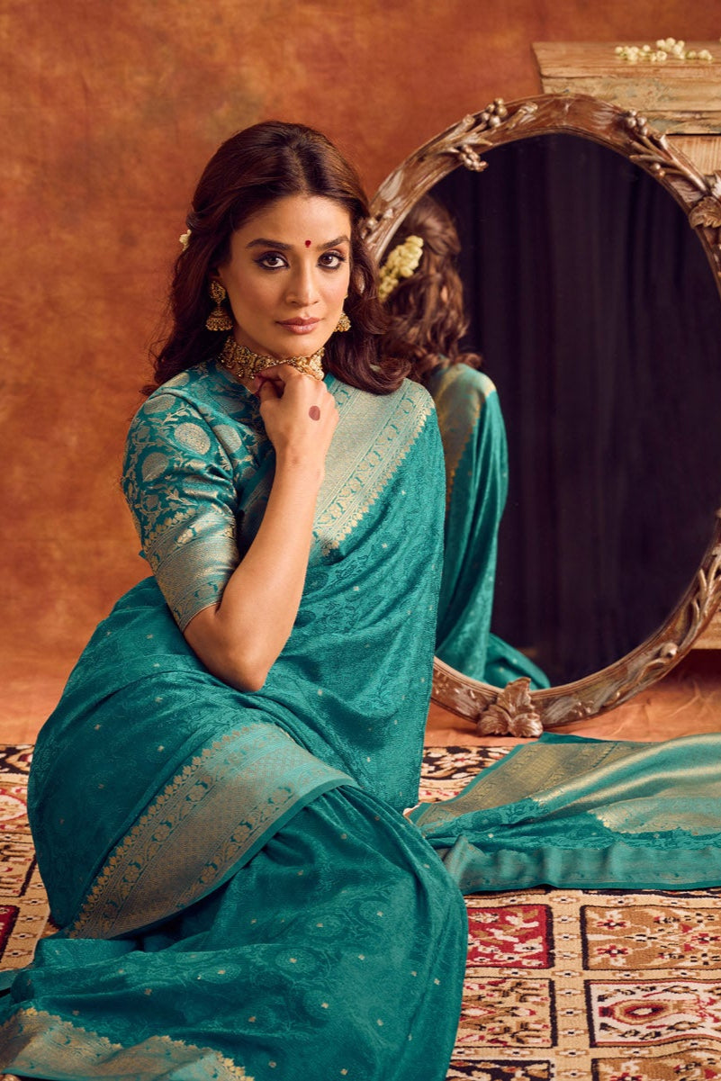 Teal Blue Viscose Jacquard Saree with Gold Border